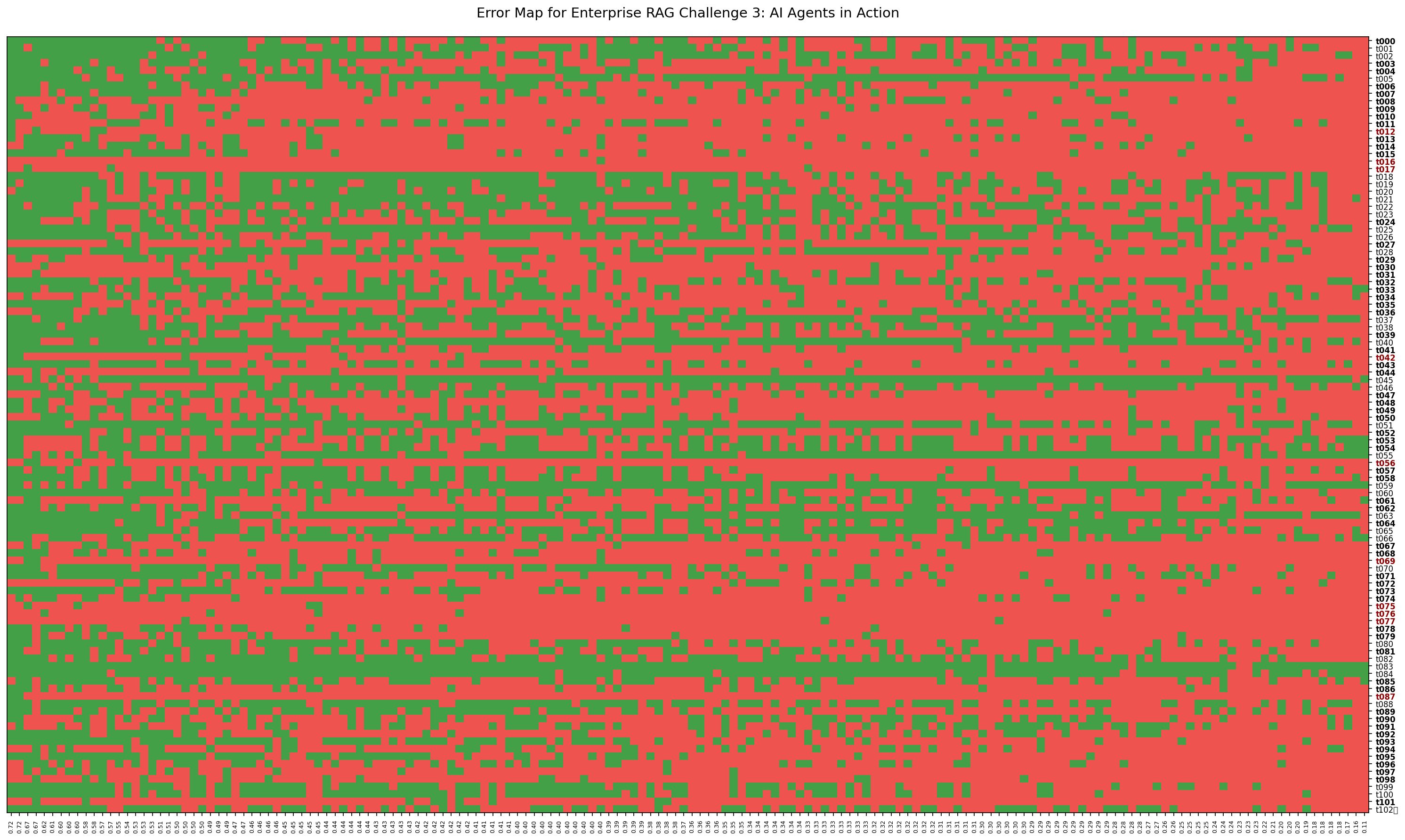Each vertical column is one submission (they are sorted by scores descending), each row - a single task in ERC3-PROD. Cell is green if an agent answered correctly, red means mistake.